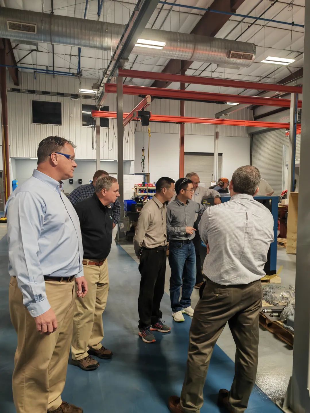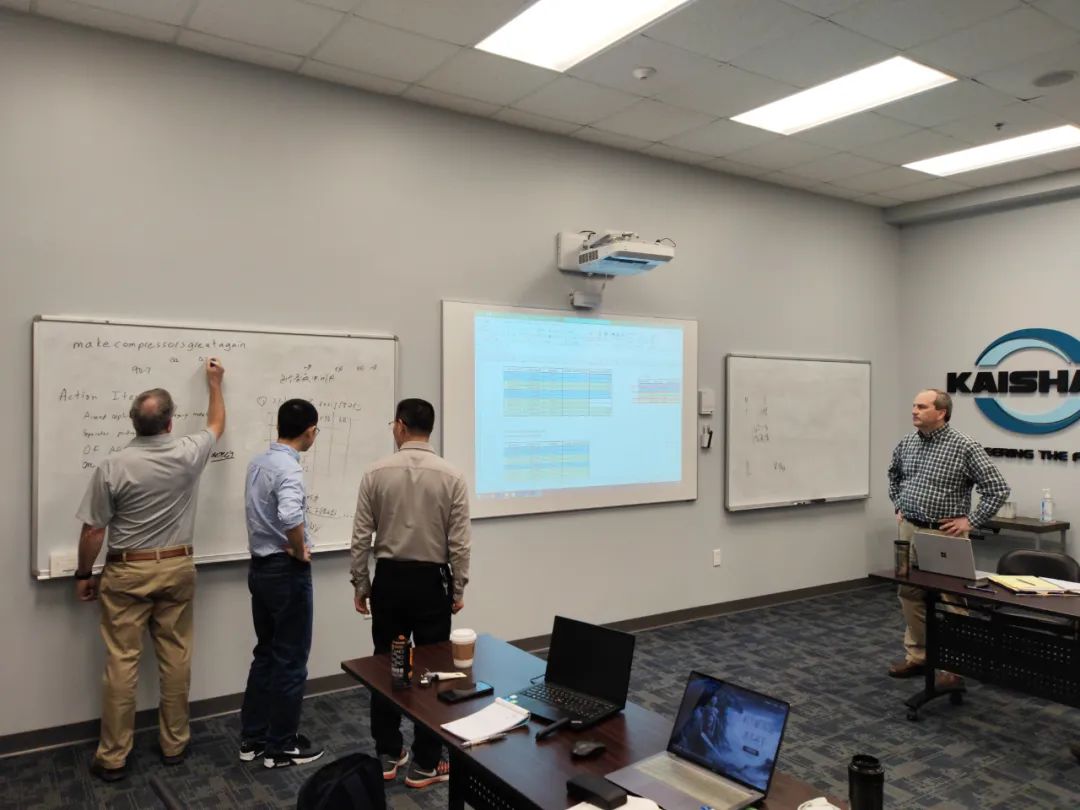 KCA總裁Keith先生和他的同事們熱情接待了來(lái)自中國(guó)的開(kāi)山同事,中美兩個(gè)團(tuán)隊(duì)就新產(chǎn)品開(kāi)發(fā)、進(jìn)一步提高運(yùn)營(yíng)效率、進(jìn)一步做好品管工作等話題進(jìn)行了充分的交流,取得了良好的成效。開(kāi)山團(tuán)隊(duì)還與干式無(wú)油螺桿空氣壓縮機(jī)研發(fā)中心工程師進(jìn)行了深入交流,并參觀了干式無(wú)油螺桿空氣壓縮機(jī)生產(chǎn)線。